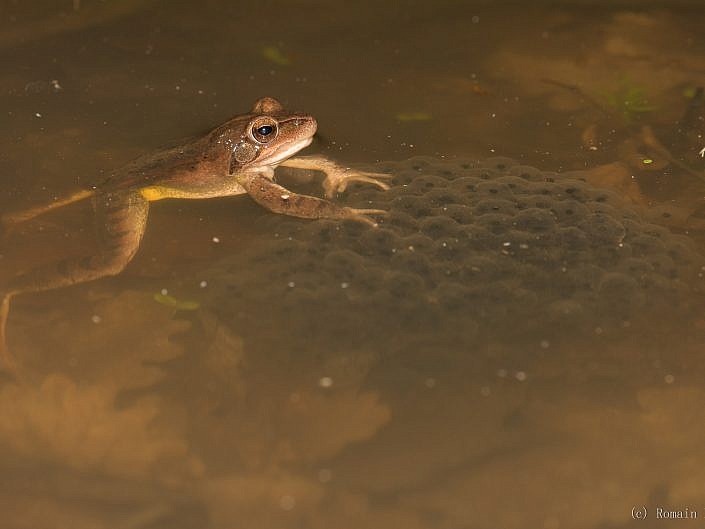 Grenouille agile (Rana dalmatina) sur sa ponte, Forêt de Bouconne (31).